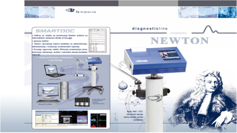 Registrovane ordinacije i klinički korisnici uvijek su oduševljeni dijagnostičkim mogućnostima, funkcionalnošću i konceptom kontrole od strane korisnika koji Newton urodinamički mjerni sistem nudi svojom sofisticiranošću urologu i ginekologu. Njegova jedinstvena fleksibilnost i mobilnost u kombinaciji s kompaktnim dizajnom osiguravaju impresivne performanse u svakodnevnoj rutinskoj upotrebi i više nego zadovoljavaju zahtjeve intenzivnih svakodnevnih kliničkih aktivnosti. Modularni sistem dozvoljava naknadna proširenja i ažuriranja, tako da su različite konfiguracije nadogradnje izvodljive bez ikakvih problema, posebno za povezivanje sa EDP ordinacijama/kliničkim sistemima. Odlukom za Newton odlučujete se za isplativo ulaganje u budućnost!